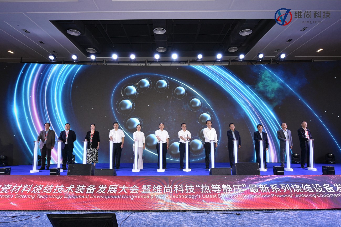 随后,高光时刻来临!株洲市委常委、市委秘书长杨英杰携市、区级相关领导,行业协会负责人与柴神洲董事长共同推杆 —— 随着启动装置缓缓点亮,本次盛会正式启幕,维尚科技 “热等静压” 新品也同步揭开面纱!这一时刻,不仅是维尚发展的新起点,更标志着国产先进陶瓷装备迈向更高质量的发展阶段!
